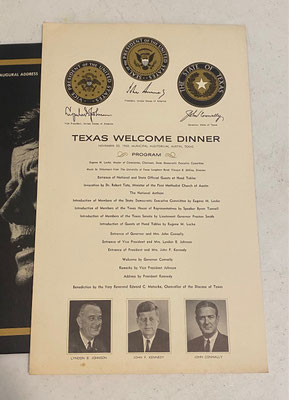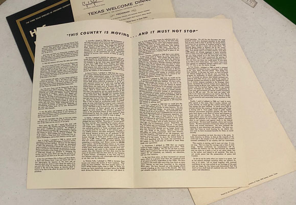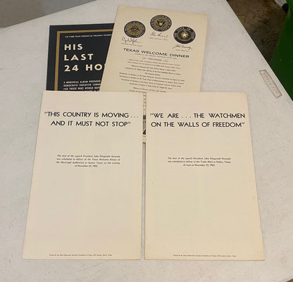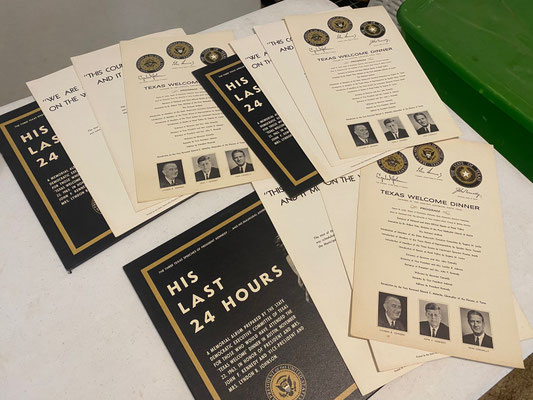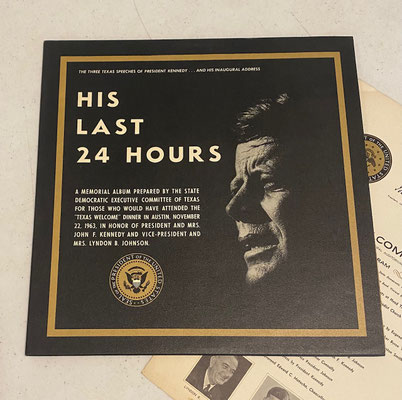 Each packet includes a souvenir one-sheet program of the dinner, sheets of the text of the speech the president was schedule to deliver, sheets of the text he was to deliver at the Trade Mart in Dallas that day and the record album with cover of "His Last 24 Hours". This memorial record album was prepared by the state committee and sent to those who would have attended the event.