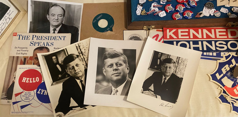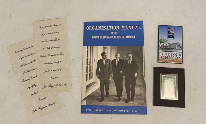 Shown here are three packets of items from the 1963 Austin, Texas event sponsored by The State Democratic Executive Committee. President Kennedy was scheduled to speak at this Texas Welcome Dinner on November 22nd, 1963, but was assassinated earlier that day in Dallas.
